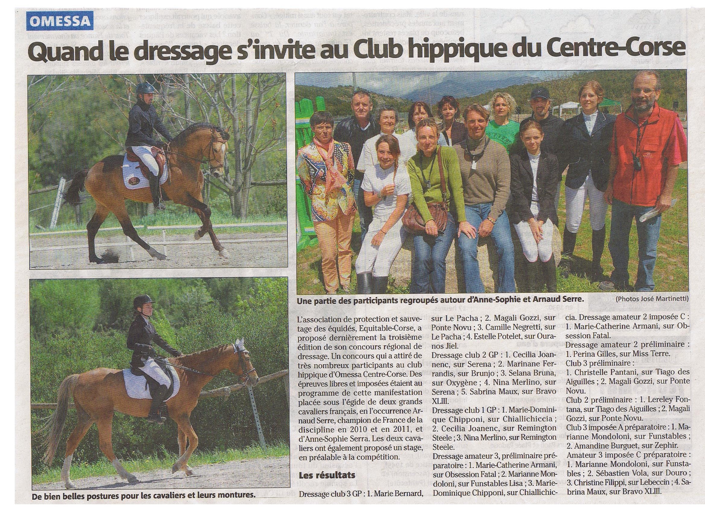 Concours de Dressage Equitable Corse au CH OmessaArticle Corse Matin vendredi 26 avril 2013Lundi 29 Avril 2013