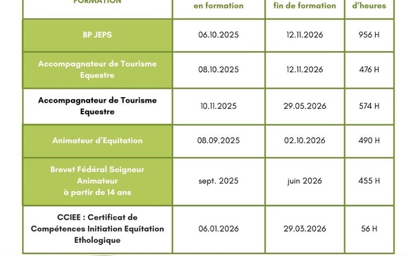 Les formations débutent à partir de septembre/octobre 2024 au sein du centre de formation Equiloisirs : - Animateur Equitation - Accompagnateur de Tourisme Equestre - BPJEPS Educateur Sportif mention...