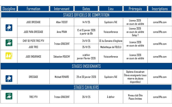 Laurent DUBORGET dispensera : > une journée de formation en Corse du Sud en date du mardi 7 mars aux écuries des Vignes (Cauro), > une journée de formation en Haute Corse en date du jeudi 9 mars aux...